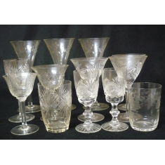 sestava 13 kusů s broušeným a leptaným dekorem, vše poškozeno - uštípnutý okraj; pouze osobní odběr nebo smluvní doprava