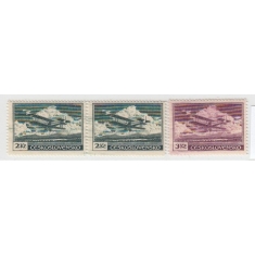 nezoubkované, 50 h zelená, 2 Kč šedozelená - smykový tisk a 3 Kč červenofialová II. typ, na růžovém makzlaturním papíru, pěkný stav, katalog Merkur 3.000Kč